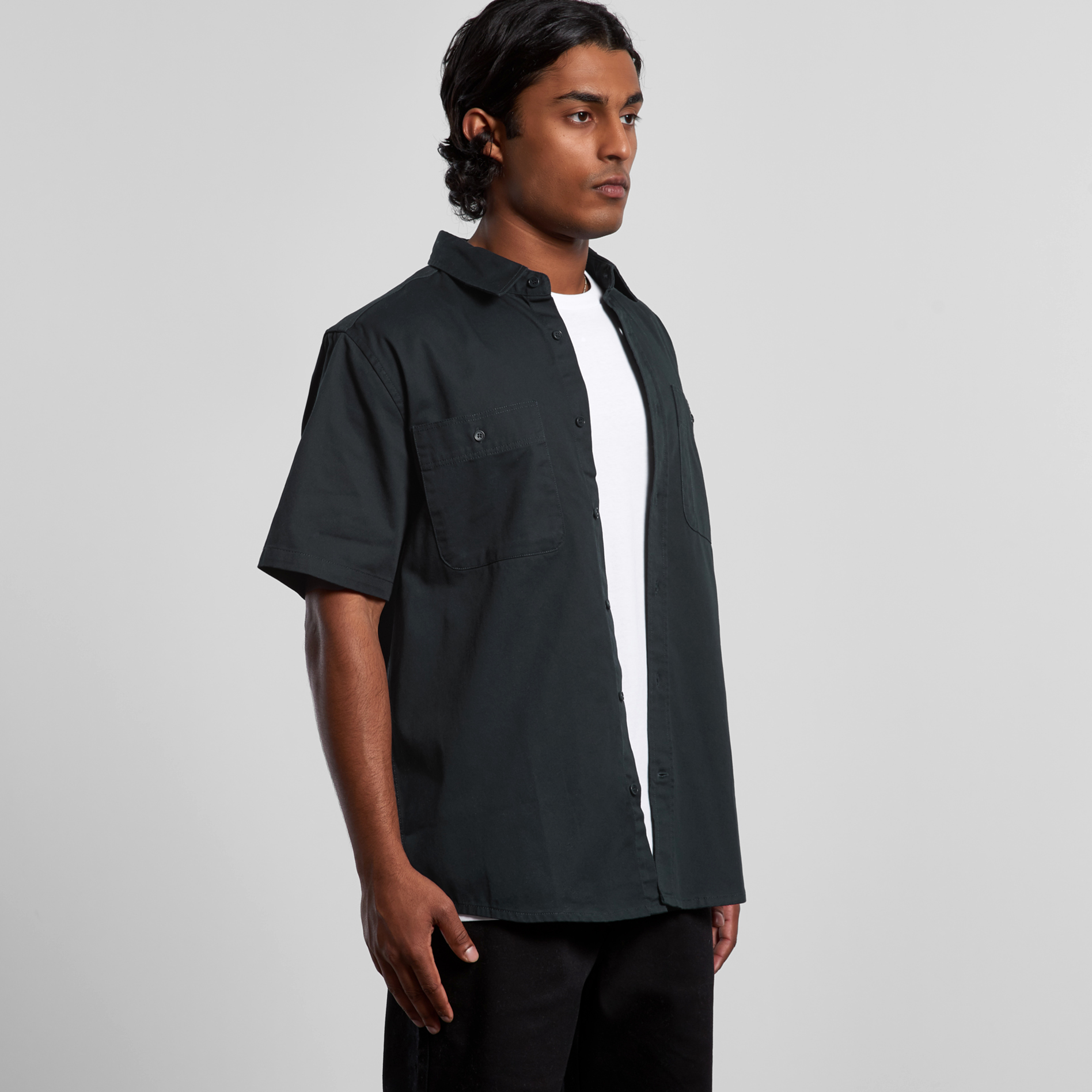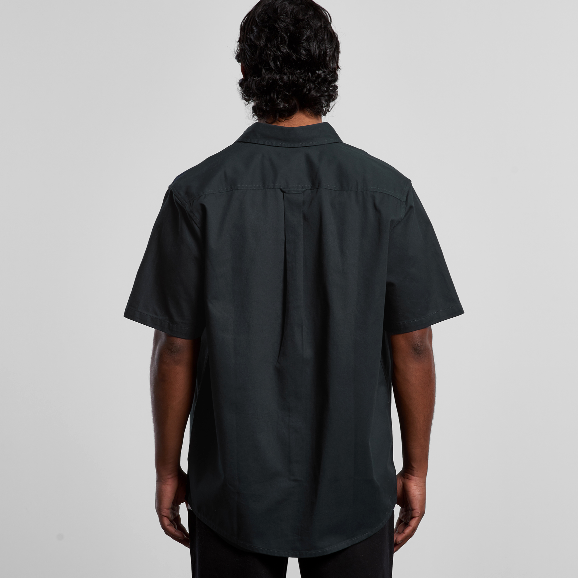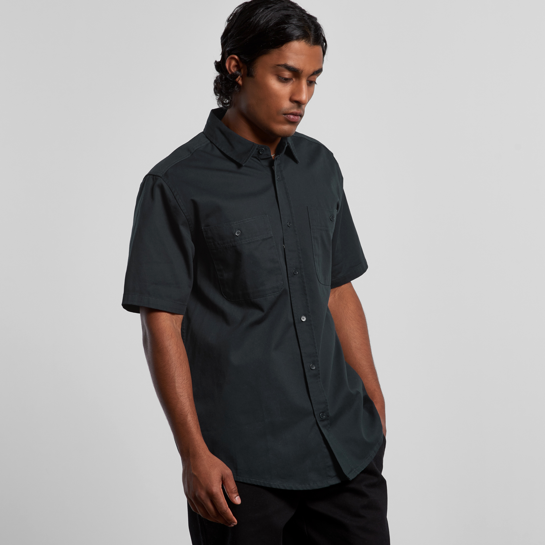 Short sleeve button up shirt, two chest pockets with pen channel, tonal buttons,  side seamed, back yoke with hang loop, preshrunk to minimise shrinkage.