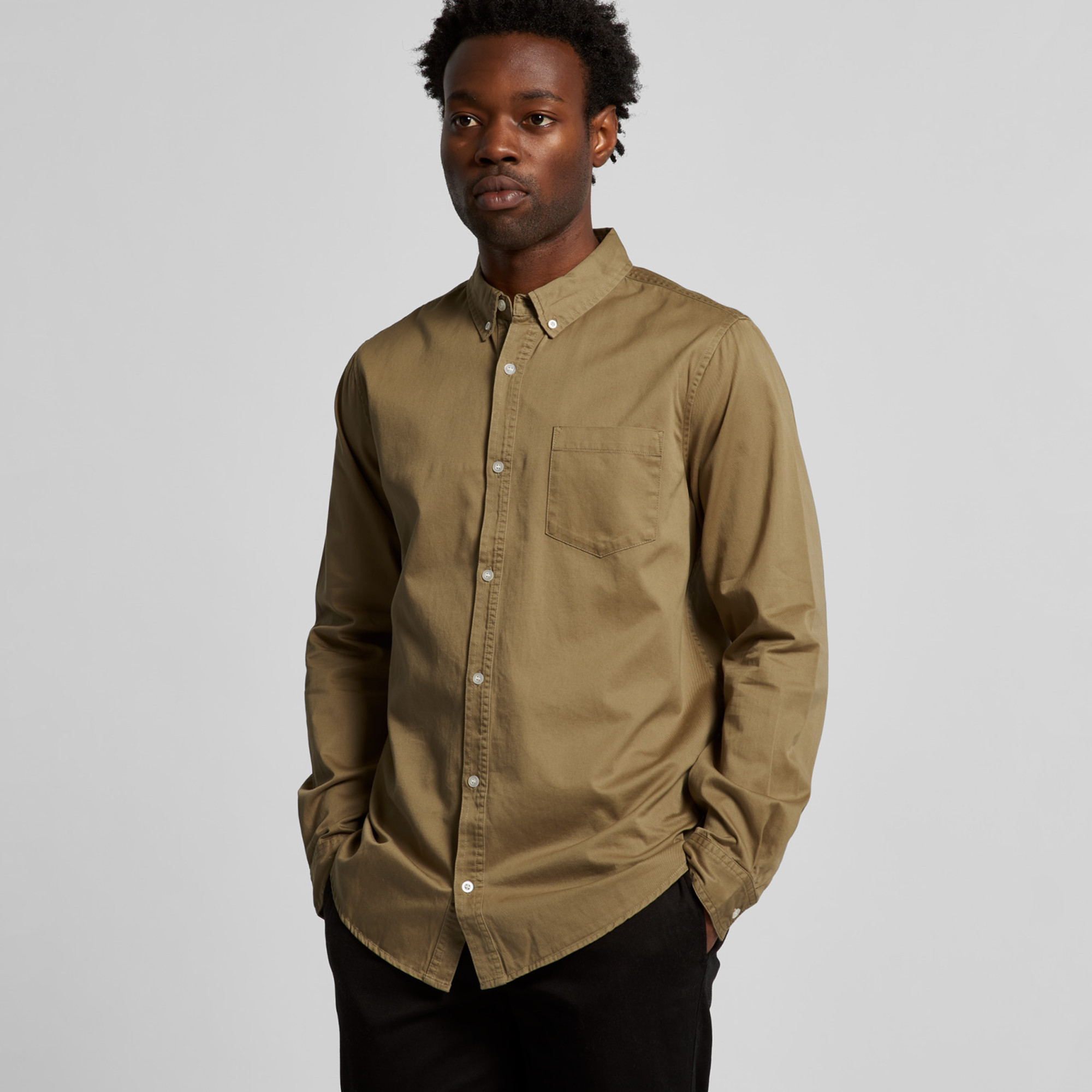 Long-sleeve button-up shirt, Double chest pockets, tonal corozo nut buttons, back yoke, adjustable cuffs, Side-seamed, preshrunk to minimise shrinkage